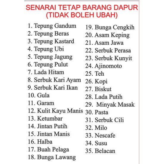 Ramai suami keliru bila beli barang dapur, sebab itulah isteri kena tulis lengkap. List barang dapur yang wajib ada di rumah · beras · gas masak · buah buahan · sayur sayuran · gula dan garam · makanan tin · biskut · teh dan kopi . Gula kopi ajinomoto susu milo cukup rasa horlicks nescafe garam teh cili kering garam halus gula merah gula melaka garam . Seperti perkongsian wanita ini, dia membuat kesemua senarai barangan keperluan yang wajib ada dirumah dan hanya perlu tanda pada barangan . Kemudian, senarai barang akan diperiksa semula dengan teliti supaya tiada yang tertinggal. Kalau anda tak beli pinggan mangkuk alamatnya tak makanlah anda sekeluarga.